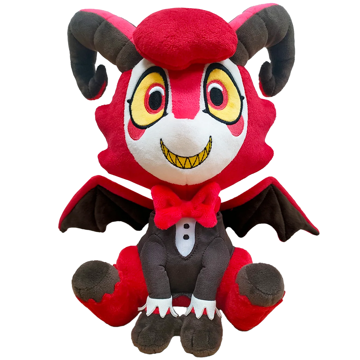 Of course we couldn't let Razzle come in for his Youtooz debut without Dazzle comin' along too! Sitting at 9 inches tall with his hooved feet kicked out wide as small hand rest at their front and lead up to their tuxedoed black and white chest as a bright red bowtie sits at their neck, a pair of huge yellow and red eyes absolutely beam out from their creme colored face as a sharp smile rests in the middle of rosy round cheeks. With long curling black and red striped horns stretching out from the top of his head on either side of a dark red puff of hair and a pair of sharp wings extending from his back, a long black pointed tail wraps around from their back. This plush is packed to the seams with 100% PP cotton and is made of the softest minky material, absolutely perfect for cuddling and being your backup whenever needed!