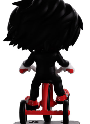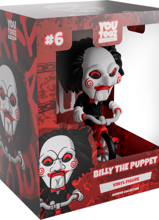 Now this is one game we definitely want to play as Billy the Puppet makes their Youtooz debut! Ready to give you the ultimate challenge and riding in atop a bright red and grey tricycle at 5.2 inches tall with his white-gloved hands gripping the handlebars and a sparkling red shoe on each pedal, his long black hair sweeps back from a white mask as bright red pupils shine out from under a thick brow. With spirals on each cheek and the lines of his puppet mouth carved around bright red lips, he wears a slick black suit over a white shirt and red bowtie. The exterior of his packaging is black and blood red with a terrifying pig masking staring outward. The interior is covered in a splotchy blood red with a series of chains running across it, these then continue onto the protective sleeve where his figure can be seen through the large clear window at the packaging’s front. This collectible ships in a matte, embossed, protective outer sleeve and a custom-sized plastic protector for maximum protection during shipping.